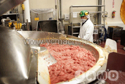 該機可以將分割過的鮮肉或經(jīng)過切片的凍肉(決不允許將大肉塊直接投入鍋內(nèi))加工成不同粒度的肉陷、肉糜,并可在斬拌過程中添加各種輔料與肉混合,同時可以抽取真空,在真空狀態(tài)下進行攪拌,使之成為達(dá)到灌制要求的物料。該機不僅可斬切乳化各種肉類,還可以斬切乳化肉皮、筋、腱等粗纖維和復(fù)合膠原蛋白的原料,所以她是各類肉食品加工企業(yè)的理想加工設(shè)備。