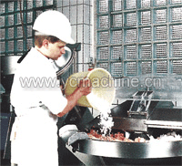 斬拌機的工作原理:放進(jìn)肉、刀轉(zhuǎn)(倒轉(zhuǎn)),鍋轉(zhuǎn)、斬完后停止轉(zhuǎn)動但是鍋接著轉(zhuǎn),將出料盤放入鍋里,開始轉(zhuǎn)(正轉(zhuǎn))使料出鍋。