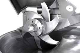 該機可以將分割過的鮮肉或經(jīng)過切片的凍肉(決不允許將大肉塊直接投入鍋內(nèi))加工成不同粒度的肉陷、肉糜,并可在斬拌過程中添加各種輔料與肉混合,同時可以抽取真空,在真空狀態(tài)下進行攪拌,使之成為達(dá)到灌制要求的物料。該機不僅可斬切乳化各種肉類,還可以斬切乳化肉皮、筋、腱等粗纖維和復(fù)合膠原蛋白的原料,所以她是各類肉食品加工企業(yè)的理想加工設(shè)備。